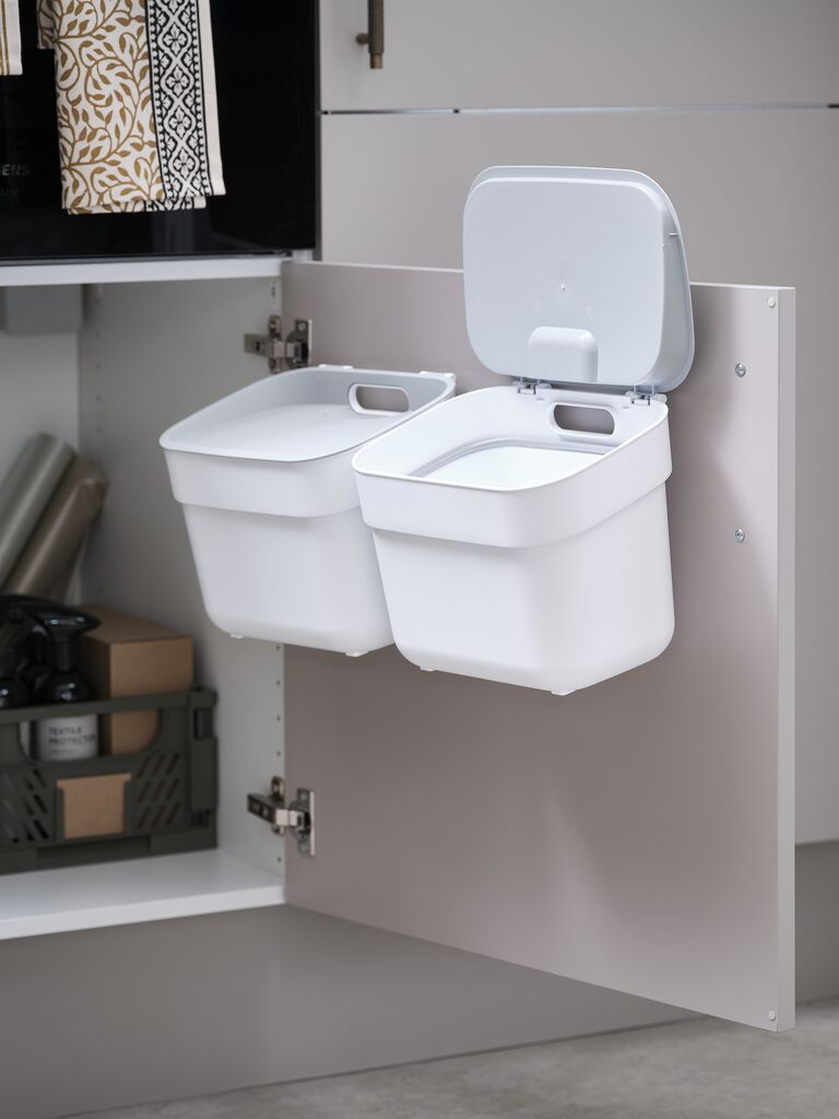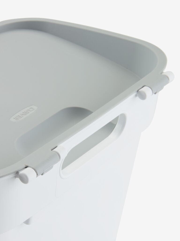 Weißer 5-Liter-Mülleimer von Ready to Collect by Curver. Der Mülleimer besteht aus Kunststoff (100% recycelt), der langlebig und leicht zu reinigen ist. Er hat einen praktischen Kippdeckel und ist ideal für die Mülltrennung in der Küche oder im Hauswirtschaftsraum. Alle Mülleimer der Ready to Collect-Serie können gestapelt oder an der Wand montiert werden, um Platz zu sparen. B19 x L25 x H20 cm