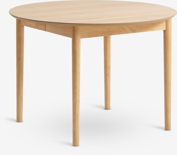 Erweiterbarer Esstisch mit Ausziehfunktion. Inklusive 2 Zusatzplatten. Der runde Esstisch hat eine Tischplatte aus Eichenfurnier und Beine aus Massivholz. Das Holz wurde für eine längere Haltbarkeit lackiert. Der Tisch lässt sich auf 200 cm ausziehen. Ø110 x H75 cm