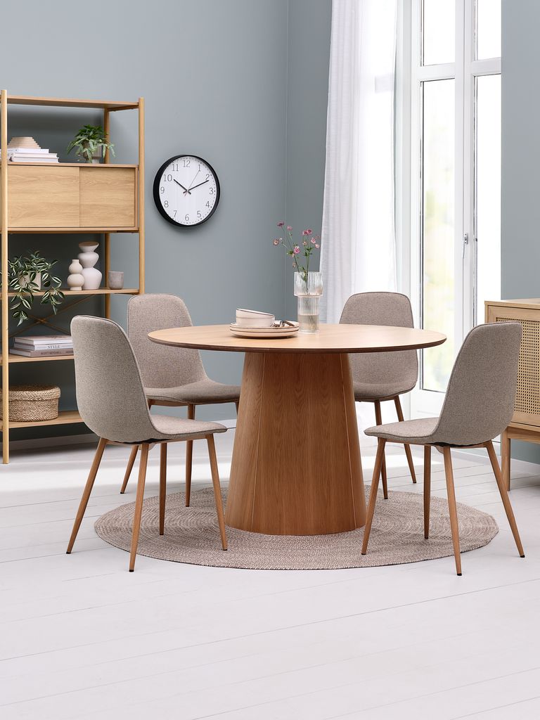 Tisch: Eichenfurnier. Ø120 x H75 cm. Stuhl: Stoff und Stahl.