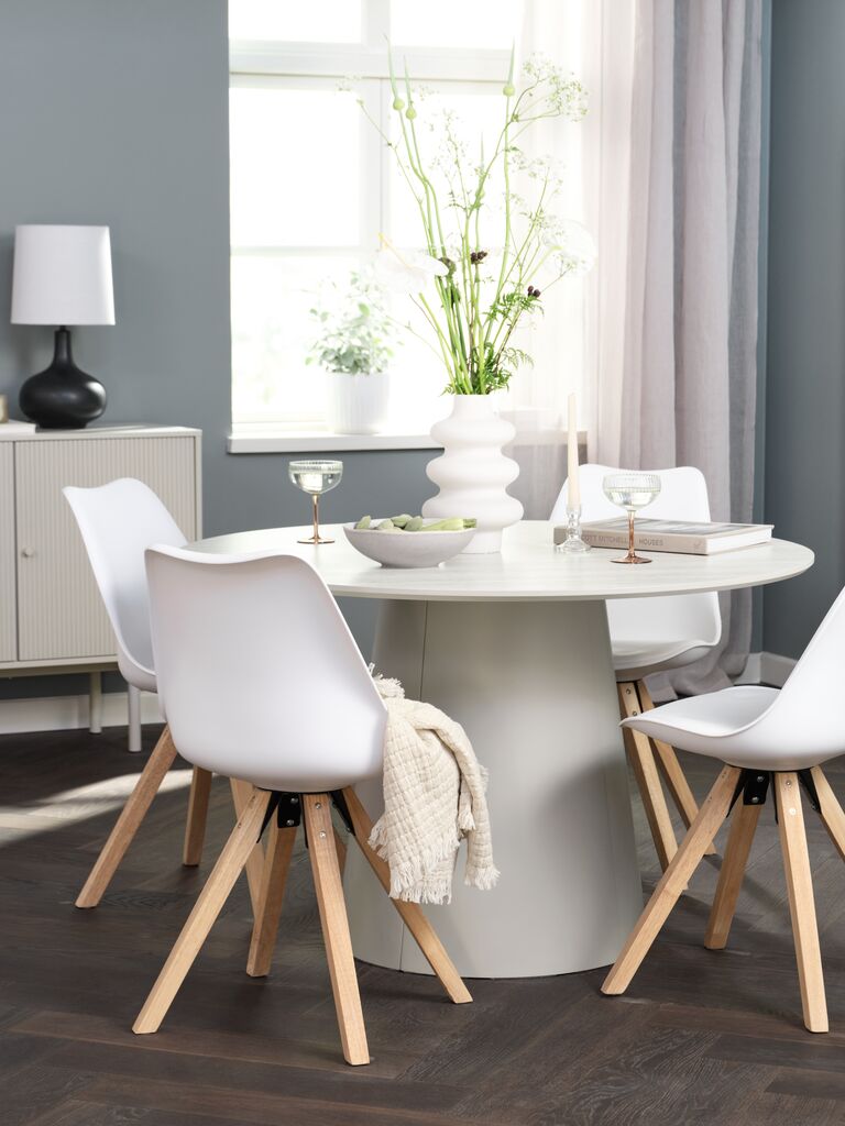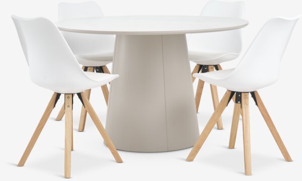 KLIPLEV + BLOKHUSKLIPLEV Ø120 Tisch Travertin + 4 BLOKHUS Stühle weiß