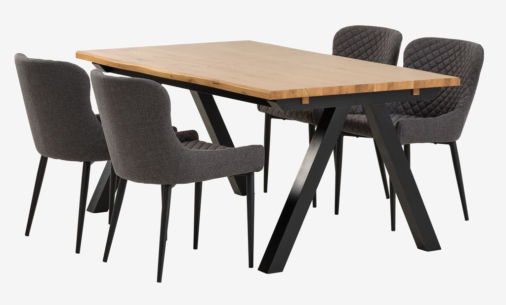 Tisch: Eichenfurnier und MDF. Exkl. Zusatzplatten. B100 x L160 x H75 cm. Stuhl: Stoff und Stahl.