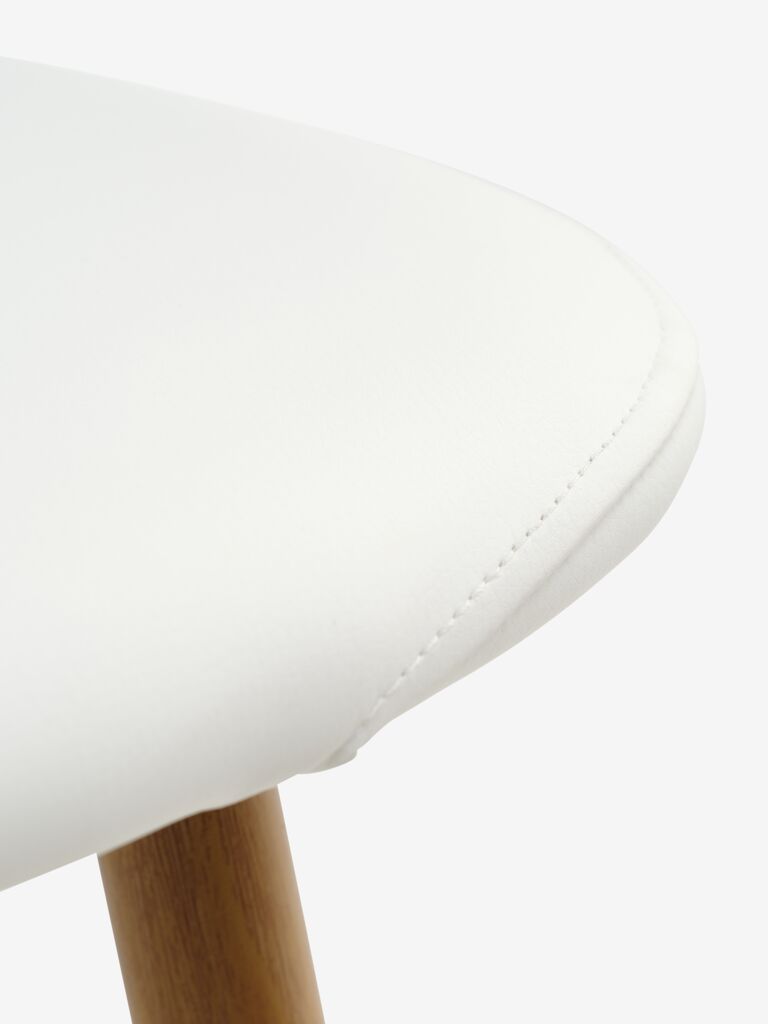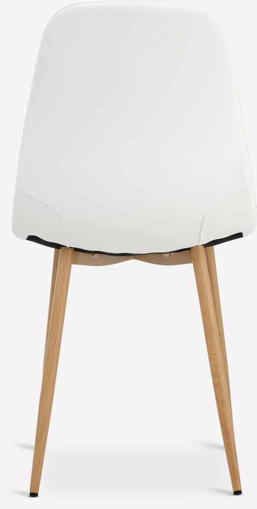 Esszimmerstuhl mit gepolsterter Sitzfläche und Rückenlehne aus weißem Kunstleder. Beine aus Stahl in Eichenoptik.