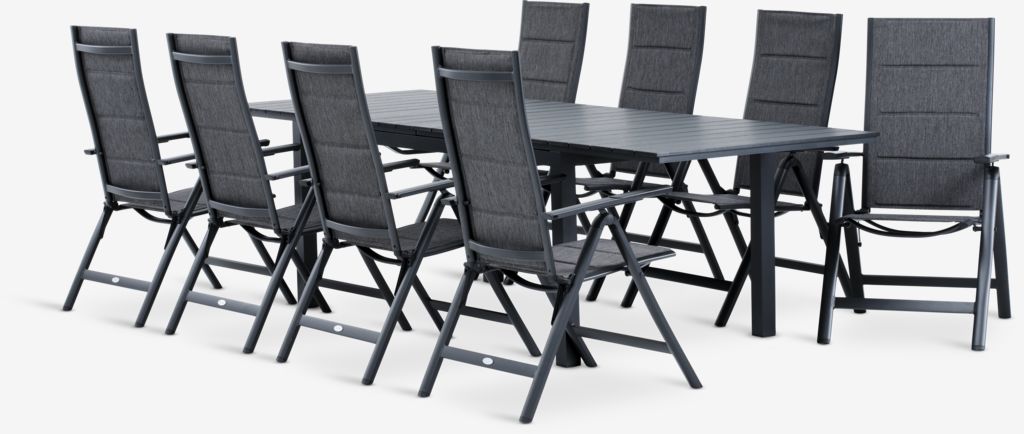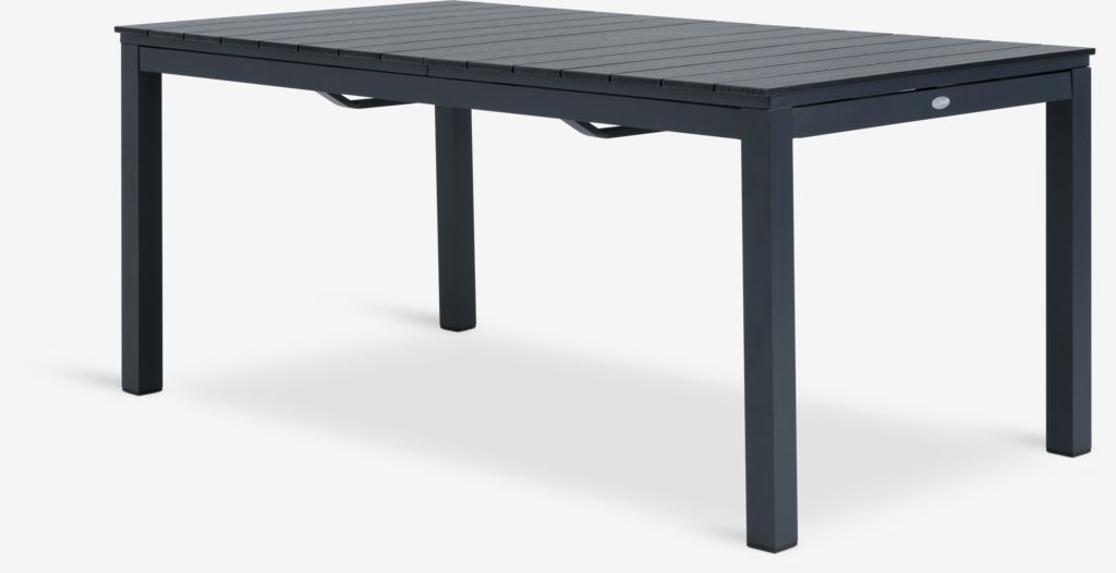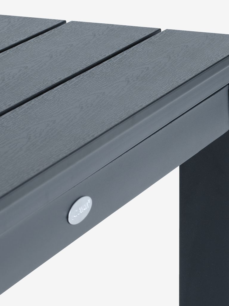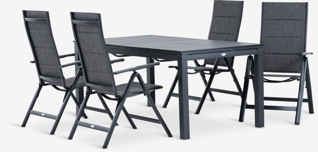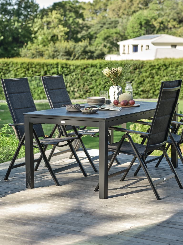 4-Sitzer-Gartenmöbel-Set. Tisch: Aluminium und künstliches Holz. Inkl. 2 Zusatzplatten, die unter der Tischplatte verstaut werden können. B95 x L170/229/273 x H76 cm. Stuhl: Aluminium, Textilene und schnelltrocknende Schaumstoffpolsterung. 6 Positionen. Zusammenklappbar.