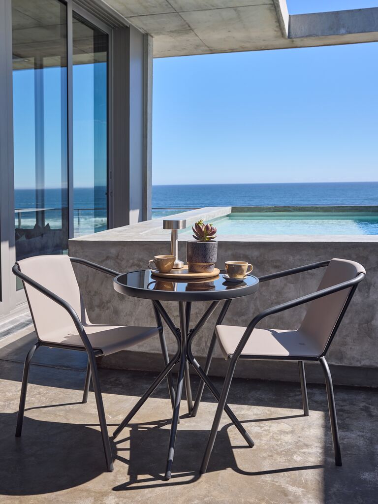 2-Sitzer Bistro-Set. Tisch: Stahl und Sicherheitsglas. Ø60 x H70 cm. Stuhl: Stahl und Kunststoff. Stapelbar.