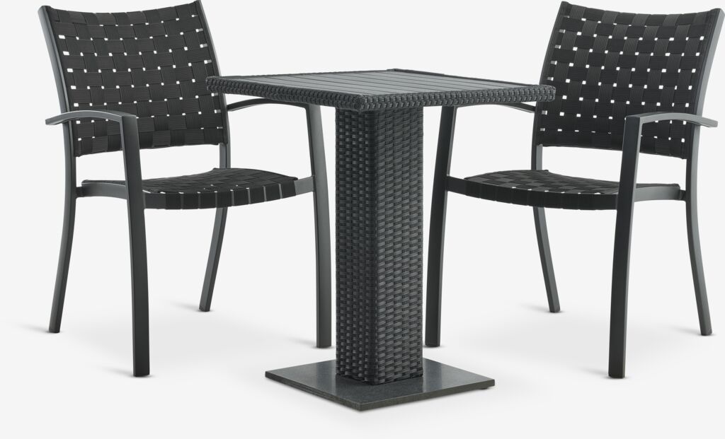 2-Sitzer Bistro-Set.Tisch: Aluminium, Granit, Polyrattan und künstliches Holz. B60 x L60 x H74 cm. Stuhl: Aluminium und Polypropylen. Stapelbar.