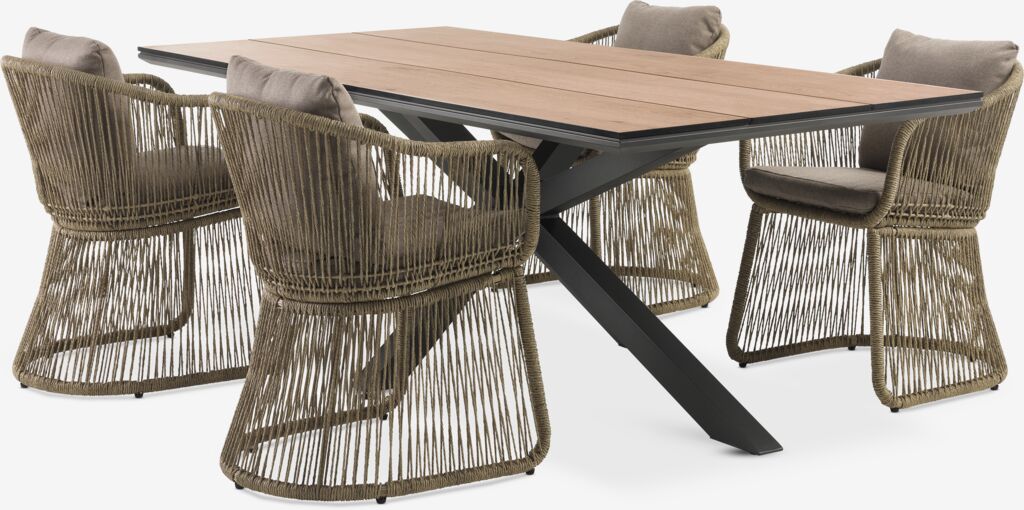 4-Sitzer Gartenmöbel-Set. Tisch: Aluminium und DURAWOOD®-Verbundholz. B100 x L215 x H75 cm. Stuhl: Stahl und Polyethylenseil. Inkl. Premium-Kissen mit strapazierfähigem, strukturgewebtem Bezug.