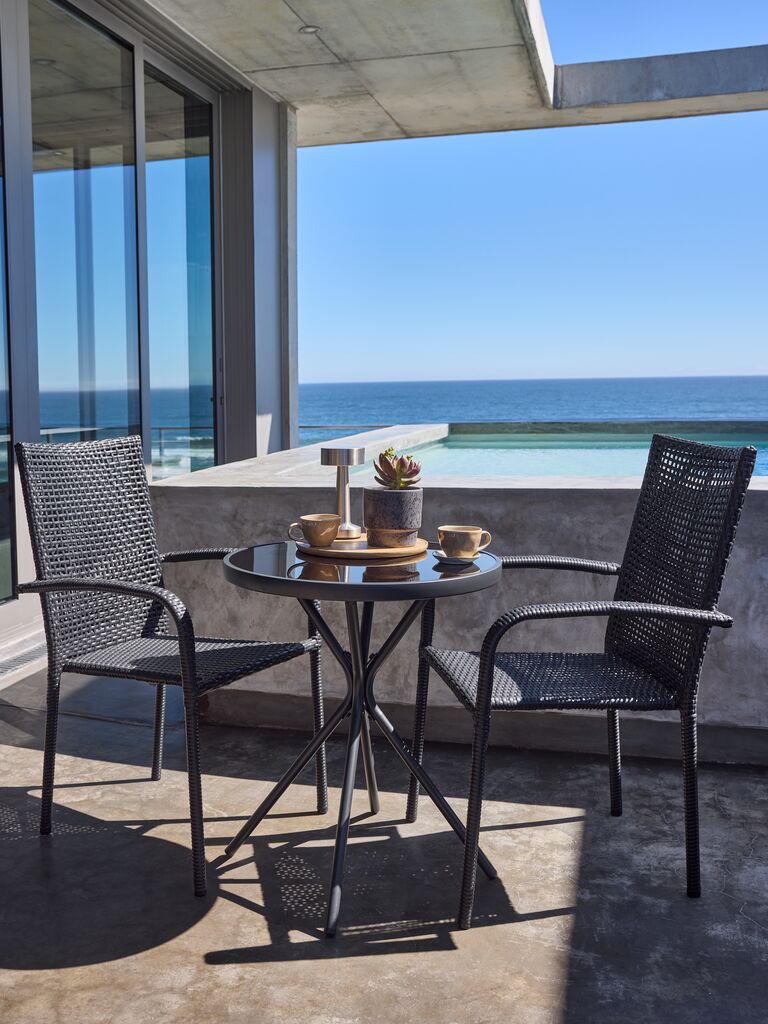 Schwarzer Stapelstuhl aus Polyrattan mit einem Gestell aus pulverbeschichtetem Stahl. Polyrattan sorgt für eine natürliche Korboptik und ist gleichzeitig witterungsbeständig und pflegeleicht. Zur kompakten Aufbewahrung kann der Gartenstuhl gestapelt werden.