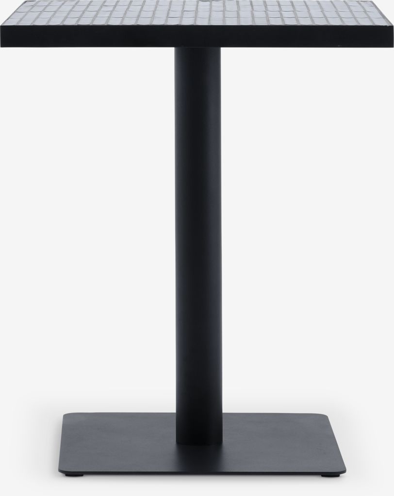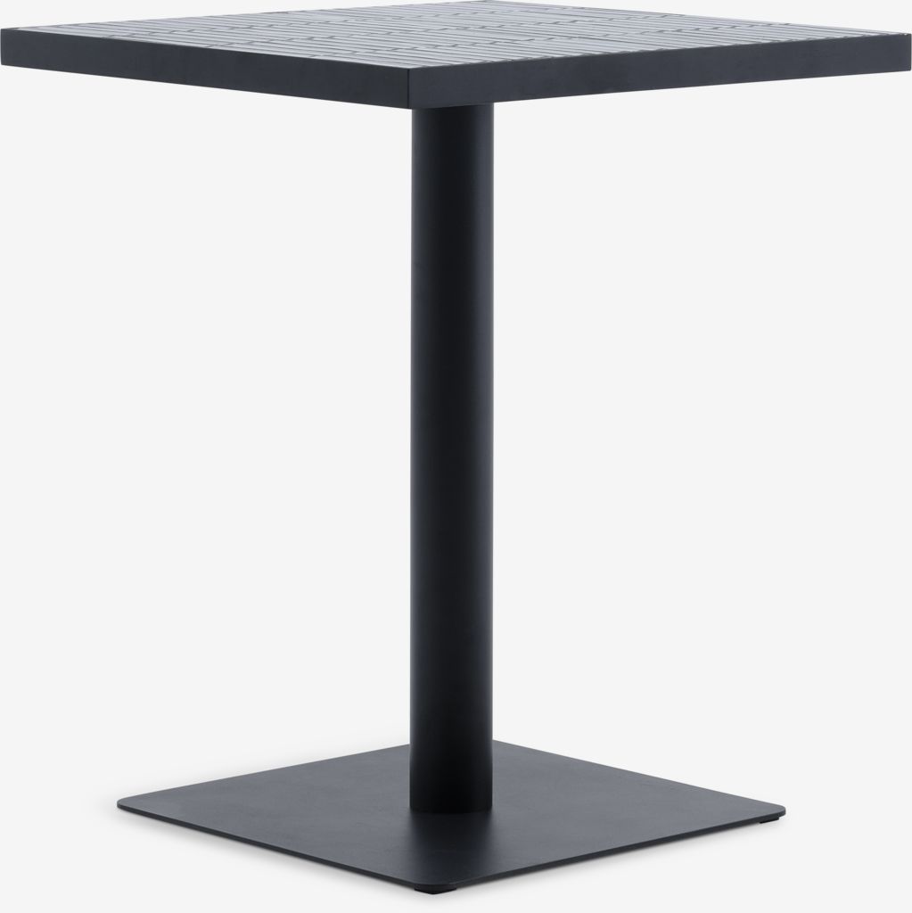 Grauer Bistrotisch mit einer Tischplatte aus hitzebeständigem Keramik und einem Untergestell aus pulverbeschichtetem Aluminium und Stahl. Aluminium ist ein leichtes und robustes Material, das nicht rostet. B60 x L60 x H71 cm