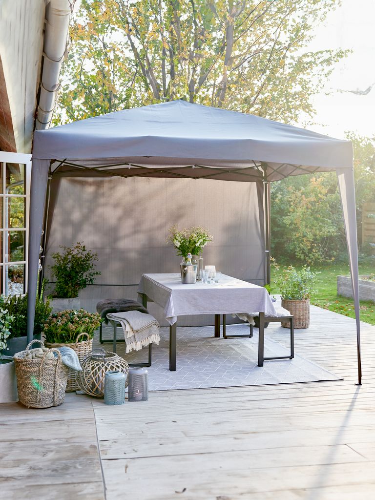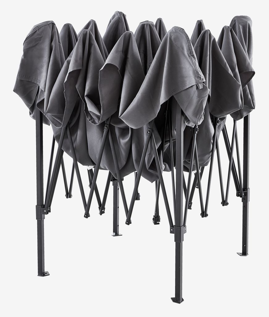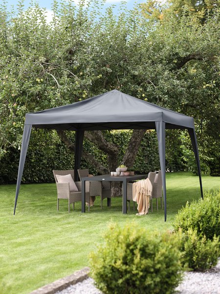 Der JERUP-Pavillon eignet sich hervorragend für Gartenfeste oder entspannte Stunden im Freien. Das graue Dach ist leicht regenbeständig und UV-geschützt, um seine Farbe zu bewahren. Dank des faltbaren Stahlgestells lässt sich der Pavillon mühelos auf- und abbauen.
