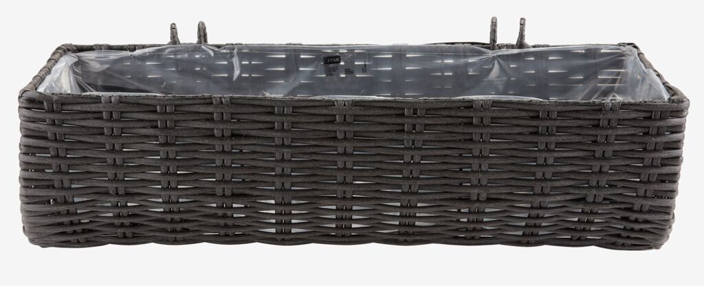 Balkonkasten mit schwarzem, geflochtenem Polyrattan-Design. Er hat einen pulverbeschichteten Stahlrahmen und ist aus frostsicheren Materialien gefertigt, was ihn zu einer langlebigen Wahl macht, um deinen Außenbereich mit Blumen und Grünpflanzen zu ergänzen. B18 x L50 x H16 cm