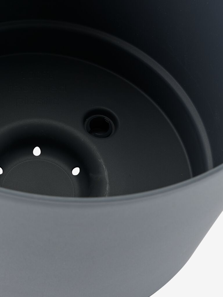 Pflanzkübel aus robustem, frostfestem Kunststoff (100% recycelt) in anthrazitgrauer Farbe. Er verfügt über einen integrierten Wasserspeicher, der die Pflanzenpflege erleichtert. Ø28 x H28 cm