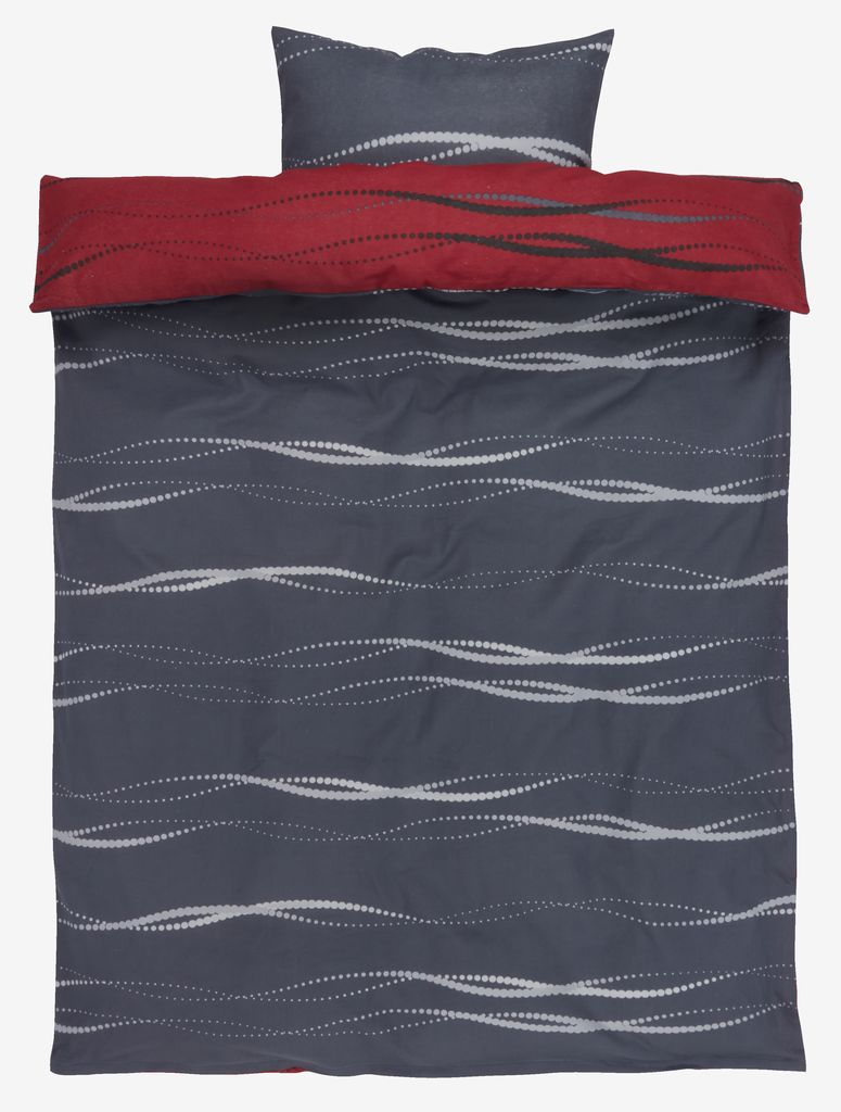 Ich habe die Bettwäsche online gesehen und vor Ort abgeholt. Reservierung war superschnell. Ausgepackt wirkt sie sehr steif und wenig gemütlich, aber einmal richtig durchgewaschen ist sie schön kuschelig. Mir gefiel die Farbe mit weinrot und eher dunklem grau. Der Kissenbezug ist wie schon erwähnt grau auf beiden Seiten, die Bettwäsche hat die Wendeseite. Ich hab sie in Übergröße gekauft im Angebot für 27,50. Reißverschluss ist YKK. Gute Qualität im Angebot, soll sonst 49.99 kosten. Habe sie nachgekauft zum Wechseln, weil ich nach den ersten kühleren Nächten mit einer Übergangsdecke sehr zufrieden war mit dem Bezug. Ich würde sie wieder kaufen, wenn ich nicht genug hätte .