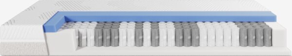 21 cm hohe Federkernmatratze 100x200 cm mit Hourglass™-Taschenfedern 265/m², unterteilt in 11 Komfortzonen. Die Matratze ist mit Polyetherschaum und druckentlastendem Gelschaum gepolstert. Der Gelschaum passt sich dem Körper an und leitet überschüssige Wärme ab. Waschbarer Bezug mit weicher, dicker Steppung.