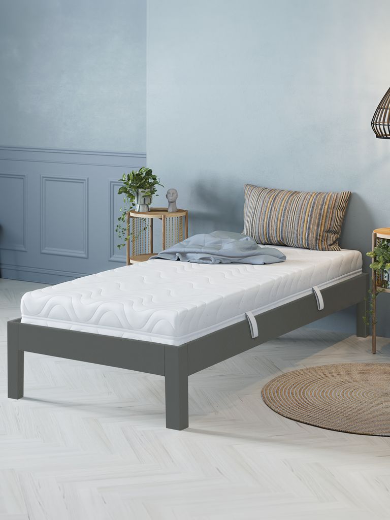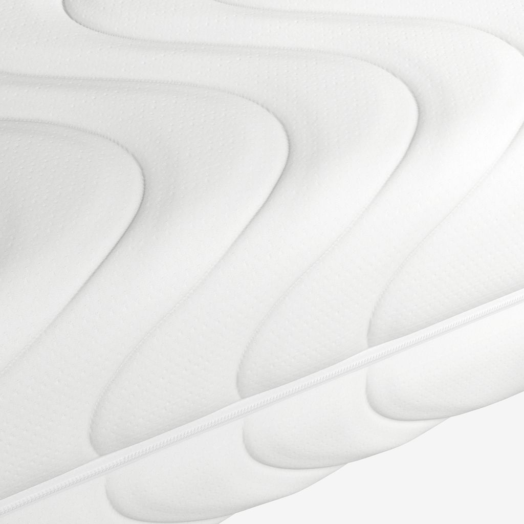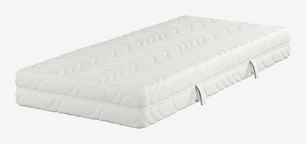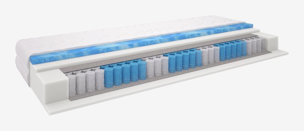 22 cm hohe, wendbare Federkernmatratze 90x200 cm mit 240 Taschenfedern/m², unterteilt in 7 Komfortzonen, die eine passgenaue, ergonomisch korrekte Unterstützung bieten. Die Polsterung der einen Seite besteht aus druckentlastendem Gelschaum und Polyätherschaum; auf der anderen Seite ist es ausschließlich Polyätherschaum. Der Gelschaum passt sich dem Körper an und leitet überschüssige Wärme ab. Waschbarer Bezug mit einer dicken Steppung. Der Bezug enthält TENCEL™ Lyocellfasern, die durch effiziente Feuchtigkeitsregulierung für ein natürlich trockenes Gefühl sorgen.
