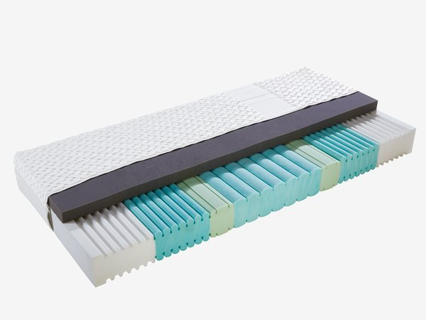 | Komfortzonen | Die Komfortzonen sind so konzipiert, dass sie verschiedene Körperbereiche wie Kopf, Schultern, Lendenwirbelbereich, Hüften und Beine besonders unterstützen. Die Zonen variieren in der Festigkeit, um zum Beispiel eine zusätzliche Lendenwirbelstütze oder eine tiefere Schulterzone zu bieten. Durch die gezielte Unterstützung in bestimmten Bereichen tragen die Komfortzonen dazu bei, den Gesamtkomfort zu erhöhen, eine gesunde Schlafposition zu fördern und Druckstellen zu reduzieren. |