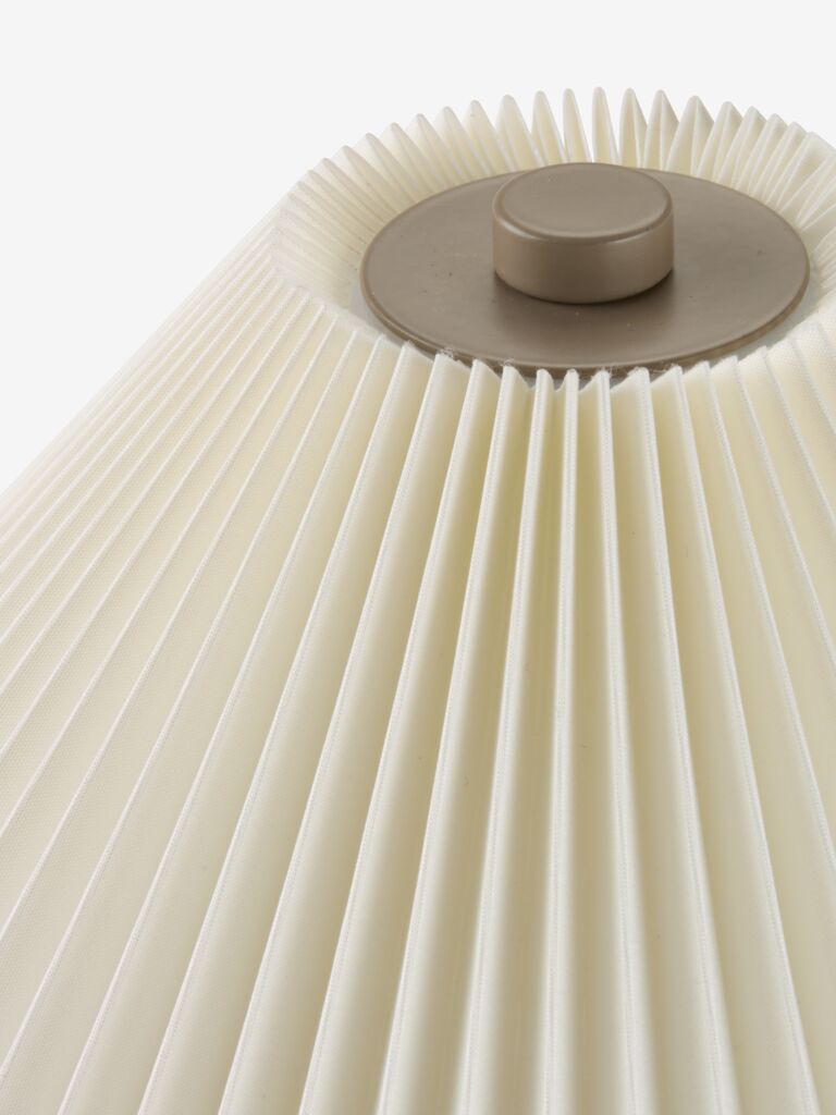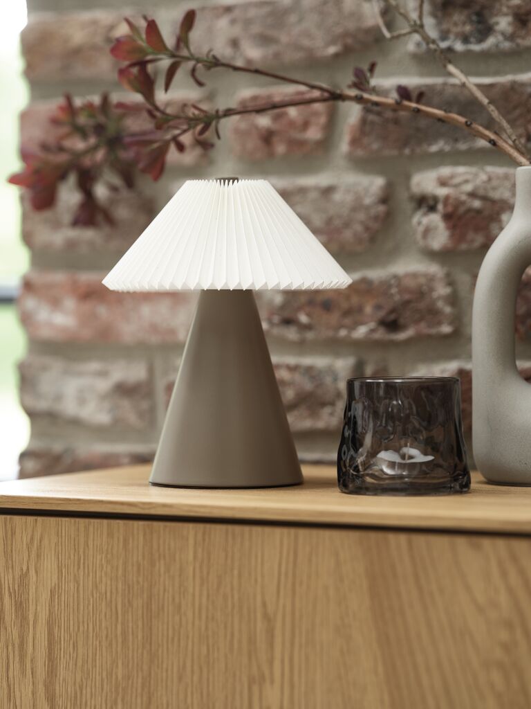Stahl und Kunststoff. Lampenschirm aus Stoff. Mit Touch-Bedienung, 3 Helligkeitsstufen und Timer. Ohne Batterien. Ø17 x H20 cm